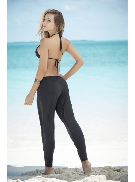 Magnifiquement pantalon legging de bain effet drapé et ceinture cravate et un haut triangle noir. Un pantalon legging de plage ample noir pour un super confort, un style très fashion et glamour qui de plus est cintré aux chevilles. Composition 85% polyester, 15% Elasthanne